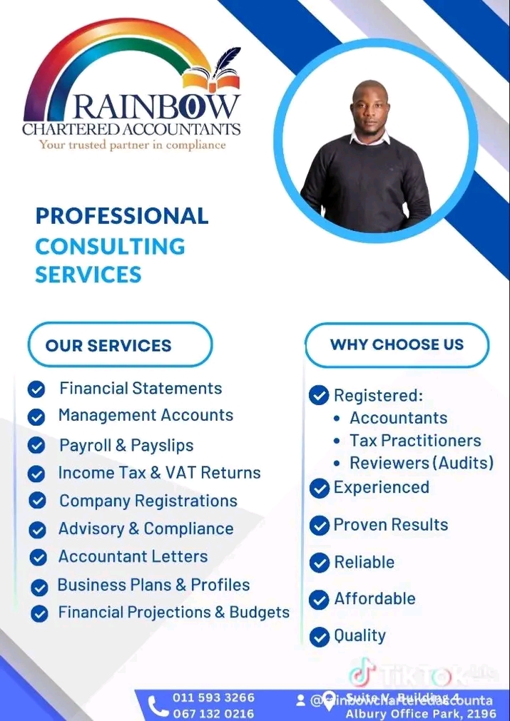 Financial Foundation with Flair: How Rainbow Chartered Accountants Built Trust through Service. When Manghezi Shipalane founded Rainbow Chartered Accountants, the goal was clear: to provide expert financial and advisory services anchored in professionalism, transparency, and client-focus. Based in Johannesburg, Rainbow has become a trusted partner for SMEs, professionals, and non-profits seeking clarity and growth. While public details remain limited, the lessons behind the firm’s approach are instructive for every aspiring entrepreneur.